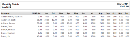 Description Hours worked by all resources for a specified calendar year, broken down by month. The internal cost of the labor is displayed when the "Amount" radio button is selected.