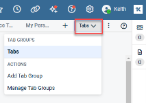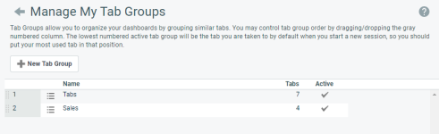 - Click Dashboards in the top navigation bar and under Actions select Manage Tab Groups. The Manage My Tab Groups page will open.