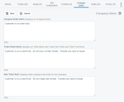 Ticket Alerts | This alert appears on the New Ticket, Ticket Detail, Edit Ticket and Ticket Time Entry pages for all tickets for this organization. |