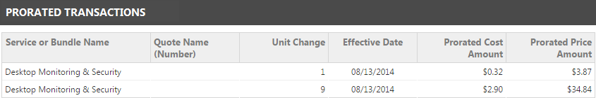 TIP The Prorated Transactions list is a valuable tool to help track cost adjustments related to Unit changes. It lists all unit changes that resulted in a change to the extended price of the service bundle or service and includes the effective date, the number of units added or removed, and the prorated cost and price amounts per unit. Refer to About the Prorated Transactions list.