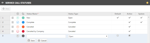Service Calls have a configurable Status attribute that is available in searches, filters, and on the Dispatch Calendar, as well as on the Service Call page and all service call lists. There are two pre-configured system statuses (New and Complete), but administrators can create up to 50 active statuses.
