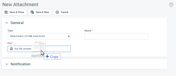 NOTE For attachments added to most entities, if you are uploading more than one attachment (Save & New), each attachment is sent in a separate email. You must complete the Notification form before you click Save & New for the first attachment and again for each additional attachment.