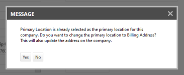 If you click Yes, that is, if a different location is assigned as the primary location, that location's address information will update the organization record. Contacts, devices and tickets that are associated with the primary location will have their address updated, as well. - If you clear the Primary Location check box without selecting another one, a message opens. It warns that if you continue, the organization will not have a primary location and so the organization record address will not be synced with any location. The Location fields on contacts, devices and tickets cannot be autopopulated.