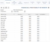 The Profitability by Month table displays the revenue, cost, profit and profitability for the organization over the past 12 months, not including the current month. It is intended to show a historical trend for these financial metrics. To open the page, use the path(s) in the Security and navigation section above.