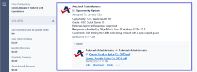 If the client fills out the Comments field on the Approve/Decline Quote page, that text is used to create a note on the associated opportunity, with a PDF of the quote added as an attachment below.