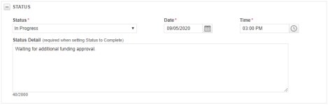 Date and Time fields | The Date and Time fields will default to the current date and time when you select a different status. You can adjust them if needed. The status Date appears in the project summary. The time is used to ensure that the date is accurate across time zones. |