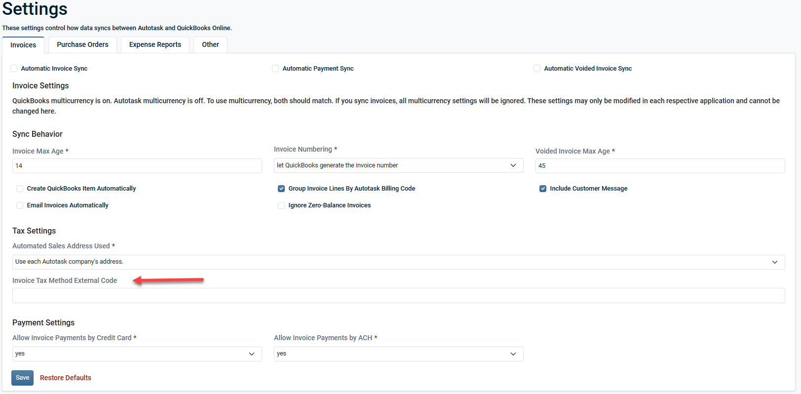 IMPORTANT  Once you enable this setting and save in the Smart Accounting Hub, all future invoices synced will use QBO AST for tax calculations in Autotask. There is no way to revert this choice or retroactively change tax calculations on invoices that have already synced.