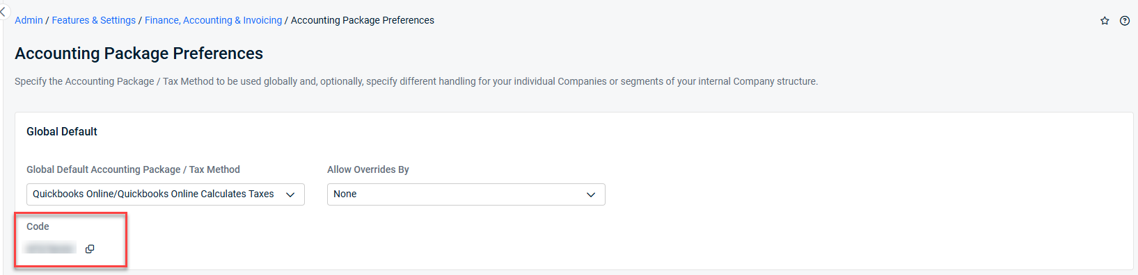 When QuickBooks Online is set as the default accounting package, a code (integration identifier) is provided. This is a system-generated, read-only value.