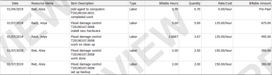 If the Roll Up setting is set to "Labor by Task/Ticket", the four labor items from the Flood Damage Control ticket (T20190107.0008) are combined into one item.