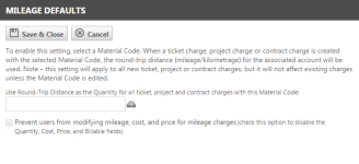 - Check the Prevent check box if you want to prevent users from modifying the mileage, cost and price for mileage charges. If selected, the Quantity, Cost, Price and Billable fields on the Charge page will be read-only.