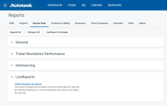 IMPORTANT LiveReports can be published to any resource, regardless of their security level access to an area of Autotask (for, example, CRM) or their standard Report Category access. Security level data restrictions apply; that is, the reports will include only data the resource has security level permission to view. For example, if the resource has no organization "view" permissions, no organization information appears in the report output.