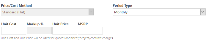Unit Cost, Markup %, and Unit Price are linked. Populate any two, and the remaining field is calculated. This field is grayed out until either the Unit Cost or Unit Price field are populated. NOTE If you do not have permission to view internal cost data, this field is not visible. |