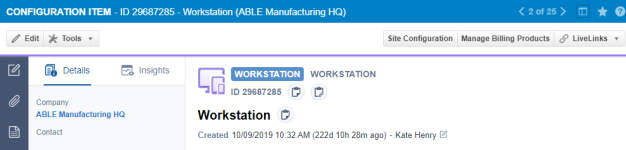Click to toggle between 2-panel view and tabbed panel view. When the icon is clicked, the Details and Insights panels are displayed to the left of the Main panel in a tabbed view. When the icon is not clicked, the Details panel is displayed on the left, and the Insights panel is displayed on the right. If your browser window is less than 1230 pixels wide, the ticket page is automatically displayed on the tabbed view. |