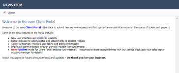 News Items are announcements that appear on all pages of the portal for all clients. They are a great way to communicate time-sensitive and late-breaking information (such as a planned system outage or upgrade period) to your customers.