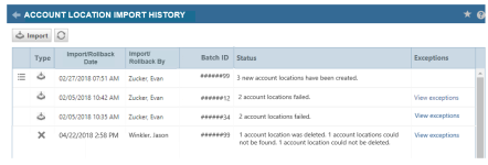 - If some records failed to be imported, you can click the View exceptions link in the Exceptions column. This will open a .CSV file that contains all records that failed to import, with the first column displaying the reason for failure.