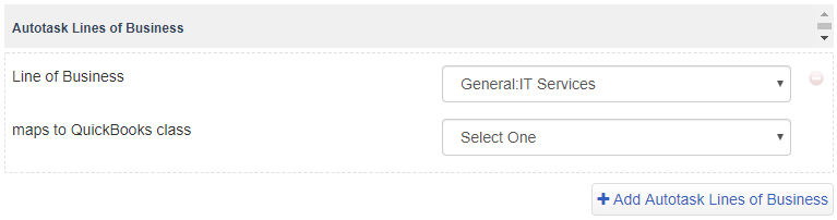 - Click +Add Autotask Lines of Business and select a line of business from the drop-down menu. You can add up to 10 lines of business to filter by and map to a class.